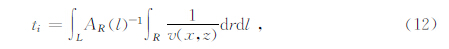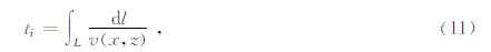 走时对速度的偏导数,二维情形下,依据射线理论,某一条射线L的走时ti是对沿射线路经的速度v(x,z)倒数的线积分: