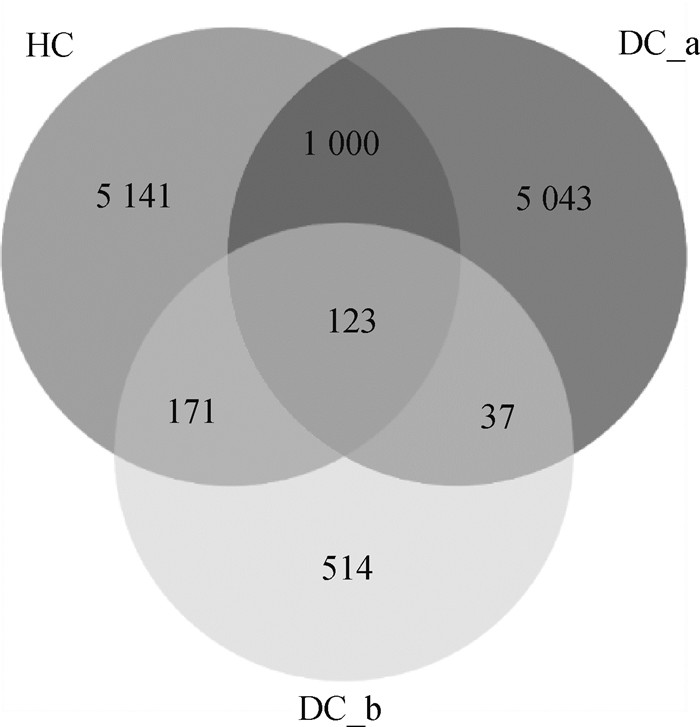 图 1 HC组、DC_a组和DC_b组肠道菌群的OTUs韦恩图 Fig. 1 Venn diagrams of OTUs of the intestinal flora of the HC, DC_a and DC_b groups |