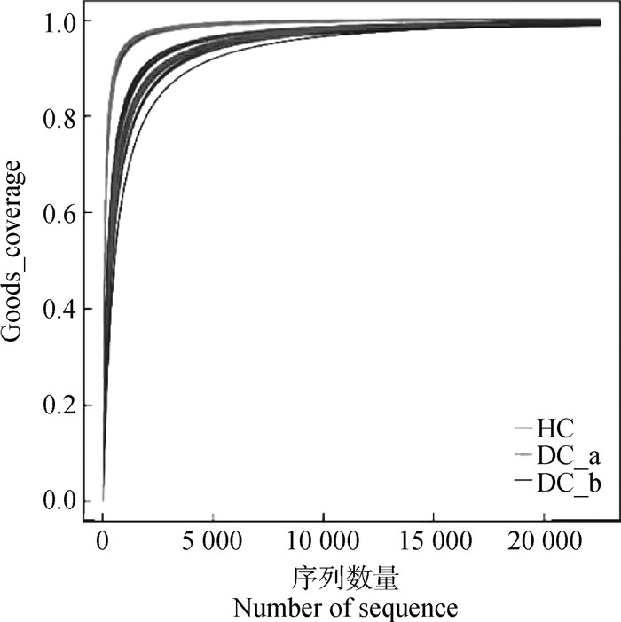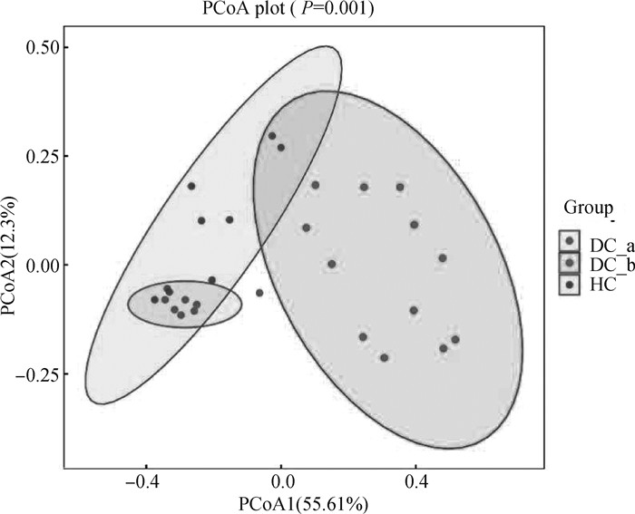 2.1.3 β多样性分析 PCoA分析中(图 4),PCoA1和PCoA2这两个主成分的贡献值分别为55.61%和12.3%,正常(HC)及腹泻样品(DC_a、DC_b)能够明显区分,并且每组样品较为集中,表明所采集的样品重复性较好。