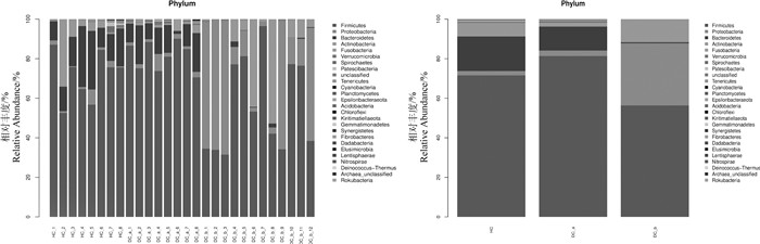 图 5 HC、DC_a和DC_b组前30菌群门水平相对丰度 Fig. 5 Relative abundance at the phylun level of the first 30 phyla of the HC, DC_a and DC_b groups |