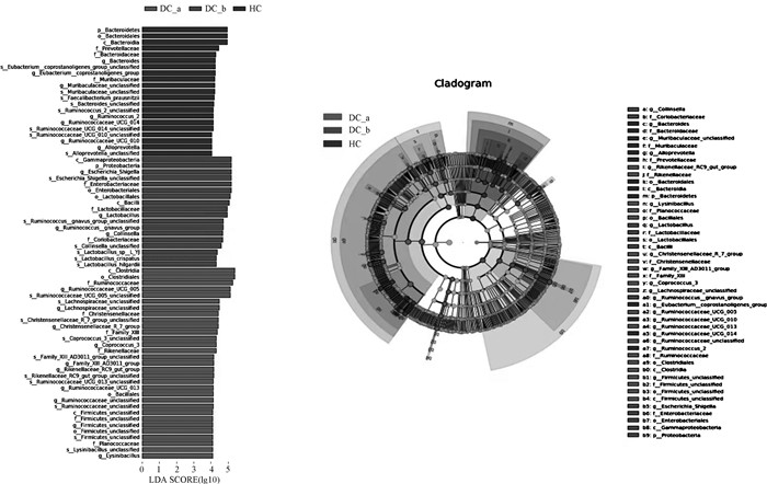 通过LEfSe (line discriminant analysis (LDA) effect size)分析,以检测细菌分类群组成的变化及鉴定相对丰度存在显著差异的分类群(生物标记物)。LEfSe分析结果表明(图 7A), 根据LDA分值>4.0,在HC组鉴定了拟杆菌属(Bacteroidetes)、普雷沃氏菌属(Prevotellace-ae)、真杆菌属(Eubacterium_coprostanoligenes_group)、Muribacul-aceae菌属、瘤胃球菌属(Ruminococcus)、拟普雷沃菌属(Alloprev-otella)等21种丰度差异显著的分类群;在DC_a组鉴定了梭菌属(Clostridia)、瘤胃球菌科(Ruminococcaceae)、毛螺菌科(Lachnos-piraceae)、克里斯滕森菌科(Christensenellaceae)、粪球菌属(Copr-ococcus)、理研菌科(Rikenellaceae)等31种丰度差异显著的分类群;在DC_b组鉴定了γ-变形菌纲(Gammaproteobacteria)、变形菌门(Proteobacteria)、埃希菌属-志贺菌(Escherichia_Shigella)、肠杆菌科(Enterobacteriaceae)、乳杆菌目(Lactobacillales)等18中丰度差异显著的分类群。