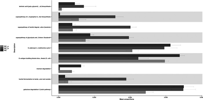 采用PICRUSt2基因预测的方法,将得到的OTUs数据以Metacyc数据库为生物代谢通路分析数据库, 预测样本的菌群代谢功能,分析差异通路。分析结果如图 8所示,与HC组相比,DC_a组在多糖、半乳糖的利用,糖的生物合成及S-腺苷-L-蛋氨酸的生物合成明显下调,DC_b组己糖醇的酵解利用、糖的酵解及L-色氨酸的生物合成上调。结果表明,肠道菌群的改变不仅影响犊牛的健康状况,还可能导致犊牛肠道菌群功能的变化。