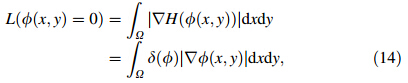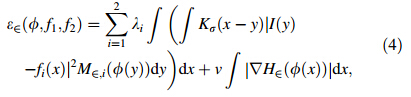 Let H(φ) denote Heaviside function and the zero level set function (φ(x,y)) represent boundary curve C. The local region control energy function can be rewritten as