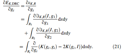 In order to ensure the level set evolution function φ,the DRC method should be able to maintain regional parameters {gi},i=1,2 unchanged. Therefore,solving the inverse of the energy functional EK;DRC region parameters needs to compute region parameters,which are generated from the local region term inside and outside,the length smooth and the potential penalty function regularization term. The level set curve evolution function is given as