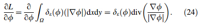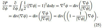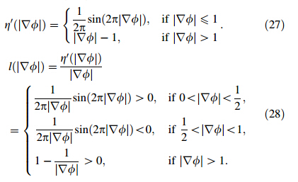 The key of the potential penalty function is the boundary corresponding to the diffusion rate which is restricted in the case |∇ φ| < 1/2. The contour evolutions are bilaterally extended,which are involved into the penalty term. Due to introducing potential penalty function η(|∇ φ|),the zero level set contour distortion can be avoided by both full domains. 3.3.2 Gradient flow for energy minimization