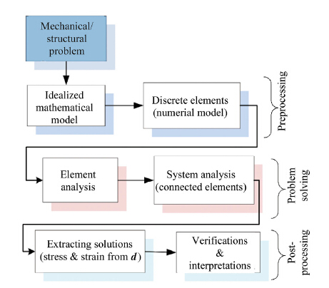 Figure 2 depicts the general workflow of the procedure for linear FEA. The shown steps are common for most applications and the solution process is performed automatically, even by users with minor knowhow about the underlying mathematical and physical laws. Based on the user input data, the simulation tool then processes the analysis task and the user has many options to collect the outputs and interpret them. However, the quality of the simulation results highly depends on the effective representation of the physical situation by a simulation model at the preprocessing phase. The way the stiffness matrix or its equivalent property matrix is established from geometrical and material data, and how the boundary conditions are defined has high impact on reliability of the results.