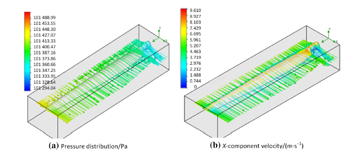 | Fig. 3 Illustration of the simulation within the computational domain a pressure, b velocity |