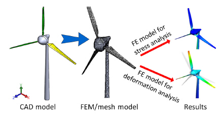 Among the available numerical computation based techniques, FEA and CFD are widely employed for wind turbines. The former is for the study of the structural behavior while the latter is for the aerodynamic performance. As illustrated in Fig. 4, the application of FEA for wind turbine structural analysis enables the study of the state of stresses and deformations for the whole turbine installation, provided that necessary information of the components in the system is available for the simulation tool. However, most studies of wind turbine are conducted at the turbine blade level where the structural and material behavior is relatively easily defined.