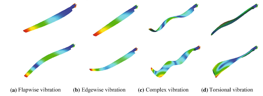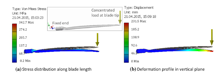 The integrated CAD/CAE environment facilitates the study of diverse flexural and torsional behaviors of the blade. For flexural analysis, the blade modeled as a cantilever beam fixed at the hub and load at the tip (see Fig. 7). This gives results that highly depend on how accurately the geometry and aerodynamic properties of the flowing air are modeled. The approach is often used to study the dynamic response of relatively long blades by assuming that there is no coupling between the transverse vibration and out-of plane bending and in-plane bending vibrations. This provides easier computations.
