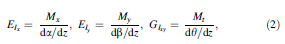 The blade rigidity is an important physical behavior used to characterize its performance and is defined by three components: edgewise (EIx ), flipwise (EIy ) and torsional (GIxy ) rigidity. These components are described by the relations given in Eq. (2).