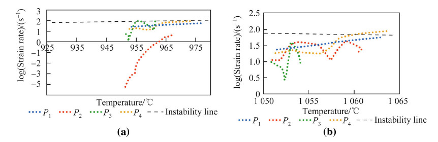 | Fig. 19Instability map obtained from numerical temperature-strain rate data for the part forget at a 950 ℃ and b 1 050 ℃ (The black line represents the border separating safe and instable zones.) |