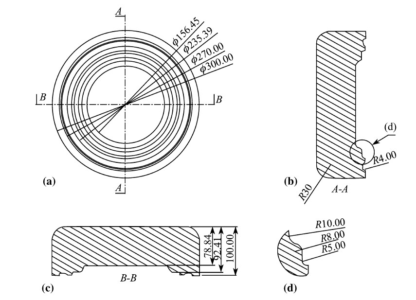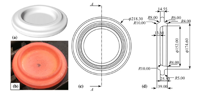 | Fig. 2Structure of the post-machining a 3D view, b as forged component, c and d drawing of the forged component (all dimensions are in mm) |