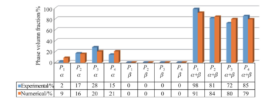 (iii) The final microstructure is mainly α+β with 10%-15% of a grains for the 950 ℃ case study. Acomplete α+β lamellar structure is found for the 1 050 ℃ case study. Good overlapping was found between the experimental measurements and numerical calculation of phases volume fraction.