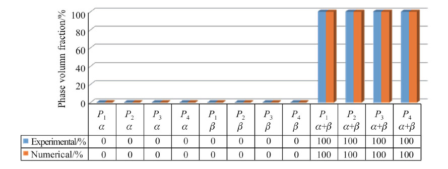 The phase prediction shows good accuracy,with an error in microstructure prevision between 1% and 8% for the 950 ℃ case (see Fig. 20). The micrographic images (see Fig. 2) show that the final microstructure includes lamellar α+β microstructure inside a matrix of globular a phase. Point P1 shows an almost complete lamellar α+β microstructure.