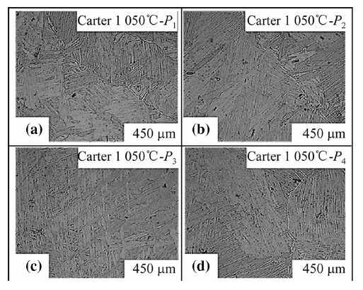 The final microstructure of the 1 050 ℃ case study is characterized by no residual α prior phase and a complete lamellar α+β morphology (see Fig. 2). This results can be observed also by the micrographic analyses of the selected points (see Fig. 2).