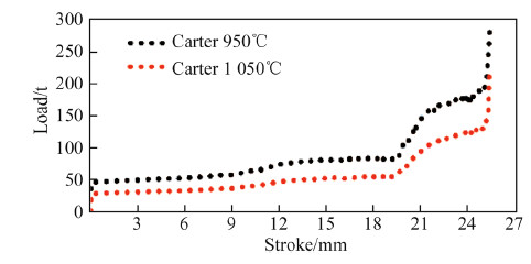 (i) An increase of about 10% of the billet initial temperature,i.e.,from 950 ℃ to 1 050 ℃,results in a reduction of more than 20% of the maximum forging load,i.e.,from 280 kN to 220 kN. This is due to the phase change occurring in the material.