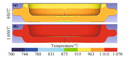 | Fig. 7Temperature colormap of the cross section of the workpiece at the end of forging stage using a 950 ℃ and b 1 050 ℃ billet temperature |