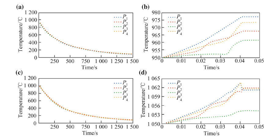 | Fig. 8Temperature evolution for a 950 ℃ case study, cool down stage; b 950 ℃ case study, forging stage; c 1 050 ℃ case study, cool down stage and d 1 050 ℃ case study, forging stage |