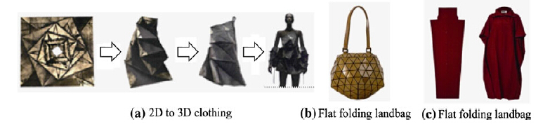 Origami engineering conical truss core panel has been applied to the absorption member and truss panel has been applied to floor structure for automobile. Origami based design is not popular in the clothing field. Miyake [1] designed clothing and bag on the basis of Origami folding, as shown in Fig. 1. Figure 1a shows the changes from flat to 3D while spiral rotation. Figure 1b is designated BAOBAO which is popular among comparatively elderly ladies in Japan. Figure 1c is created by cutting complete form and folding into flat. It can save storage space, hence it is useful in travelling. In this paper, various kinds of conical truss model [1] are generated and applied to clothing model for skirt, and simulation software is developed on the basis of parametric Origami module (POM) [2]. Furthermore, the fabricated samples designed on different conical truss models are made of felt clothing and compared considering the functions of skirt.