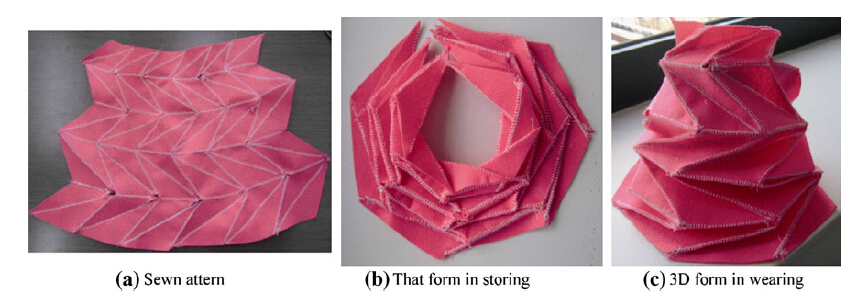 Figure 11 is the pattern of conical reverse truss model. This is copied on the prepared felt clothing with charcoal pencil, and cut one part by one part The adjacent sides are sewn by overhand stitch, as shown in Fig. 12a. The flat folded form is shown in Fig. 12b, and the 3D form is shown in Fig. 12c. This sample is the scaled model of real skirt clothing.