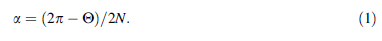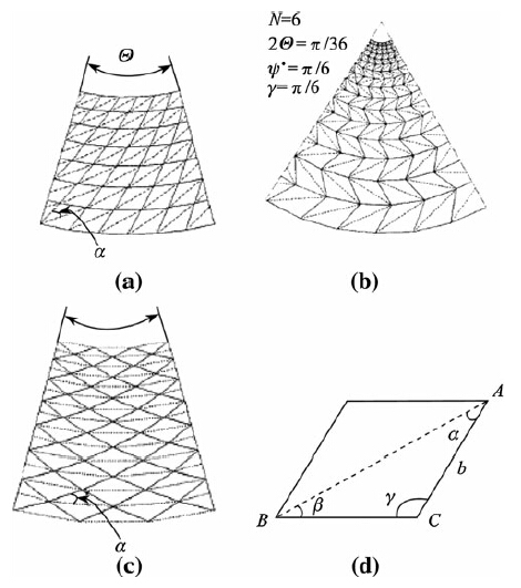 It has already been proved by Nojima that the pattern where reverse spiral structured conical is folded into flat by rotating in 360° is drawn in Fig. 2a [3, 4]. Firstly, the condition that the elements constitute the Fig. 2a is represented as Eq. (1). Here, Nis the number of triangle that stands in the circle, andHis the center angle of pattern.An angle of β can be arbitrary but to be folded flat since it has the restriction related with the angle of α. The fun shaped pattern is found to be drawn in curving lines, however all lines constituting each triangle are straight in Fig. 2b. Therefore, the way of drawing whole of the pattern is firstly drawing both the diagonal lines which divide equally the arch of fun shaped pattern and parallel lineswith arch ones. Secondly, all adjacent points are connected with straight lines. Figure 2(c) is completed by drawing step by step which is composed of triangles and have the same rate of agreement in the direction of cent orderly in thisway.Conical reverse spiral structure can be drawn in several patterns according to α, β, γ in Fig. 2a-c. The developable and foldable condition is dependent on the angles α and β. When α and β are both 30°, Figs. 2a, β and d can be applied to skirt design. Therefore, we try to fold 3 kinds of patterns for skirt design in this paper.