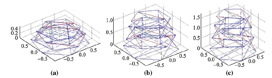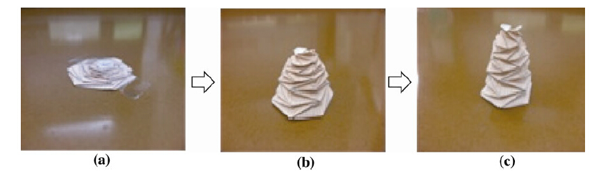 The final purpose is to develop 2D to 3D simulation software. In this paper, the conical truss model is focused on as the first step for 2D to 3D simulation. Before developing system, this model is folded with paper and its real gradual motion is confirmed, as shown in Fig. 3. This model is non rigid Origami, hence every folding line is not kept straight during being folded. Figure 3a is the flat form, and gradually transformed into 3D completion, as shown in Fig. 3c.
