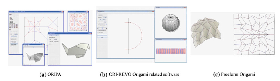 The software which creates pattern and shows complete form has already been developed by Mitani. He publishes the editor for flat Origami "ORIPA [5]" in his website, as shown in Fig. 4a for free [7]. However, the function of this editor is limited to drawing fold lines on the screen referring to the marked lines on paper and displaying the estimated completion. In this process, the correctness of folding lines drawn on ORIPA can be confirmed. It means that ORIPA is just the editor based on the existing pattern and not the software which can realize all folding process including the completion. Mitani also developed the software called ORI-REVO [6, 7], which is limited only for the shapes based on the surface of revolution, as shown in Fig. 4b. The shapes generated by ORI-REVO are based on the surface of revolution. Actually, the software not depending on shapes has not been completed by any researchers because of complex properties of Origami. While there is software called "Freeform Origami [8]" dealing with only rigid Origami, as shown in Fig. 4c. By using Freeform Origami, the simulation from 2D to 3D of conical truss model is tried to be failed. The reason is that each side of this model is bent during being folded. Considering these research results, the system functioned with editor and simulation is aimed to be developed.