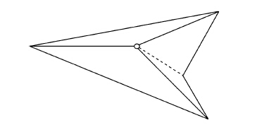 The fundamental structure shown in Fig. 5 is called POM. POM can be extracted as many different types from complex 3D origami structure. POM with the fewest number of nodes which is suitable for 3D origami structure use has been investigated. As a result, in the cases of one mountain line, one valley line, two mountain lines, one valley line, there will have an unstable curved surface and cannot be applied as POM for 3D origami structure. While in the case of three mountain lines and one valley line shown in Fig. 5, there are straight lines between nodes which make each facet become stable plane.