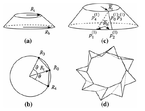 | Fig. 2 a-c Pattern of foldable conical shell, d one element of development |