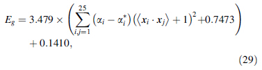 In this work, the data set consists of 25 compounds, including AlP, AlAs, AlSb, GaP, GaAs, GaSb, InP, InAs, InSb, ZnS, ZnSe, ZnTe, CdS, CdSe, CdTe, HgS, HgSe, HgTe, AlN, GaN, InN, PbO, PbS, PbSe, and PbTe [29, 30]. Based on the data set available, the SVR model for predicting Eg of AIIIBV and AIIBVI binary compounds was constructed by using atomic parameters as features including electronegativity, valence, radius, atomic mass and their functions. The data mining results indicated that the sum of proportion of atomic electrovalent and covalent radius ∑(z=rcov) [31], mean atomic number, N atomic electrovalent ZA and ZB should be selected as parameters in the model of band gap,