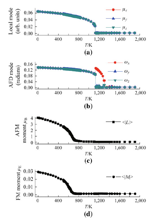 | Fig. 2 Temperature dependence of the order parameters in a BFO nanodot of 6.4 nm in lateral size and under ideal short-circuit electrical boundary conditions |