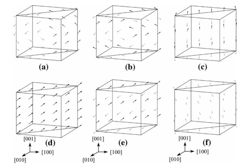 Figure 3a-c reveal that the properties of the dot under OC conditions are dramatically different from those of the dot under ideal SC conditions. For example, its ground-state structure at low temperature is very special, since it consists of a vortex formed by electric dipoles rotating in the (110) plane coexisting with a four-domain state for the AFD motions (with two of these domains having a chirality similar to that of the electric vortex while the other two domains have an opposite chirality). The electric dipoles and AFD xi vectors collectively align along one of these following four possible directions within this complex structure: [-11 -1], [-111], [1 -1 -1] and [1 -11]. This is in great contrast to the dot under ideal SC conditions, which exhibits properties that simply bear resemblance with those of the corresponding bulk: below Curie temperature electric dipoles homogeneously lie along the [111] pseudocubic direction (resulting in a polarization oriented along [111] and a vanishing electric toroidal moment), and any two neighboring oxygen octahedra tilt in opposite direction about [111] (generating a vector lying along [-1 -1 -1]).