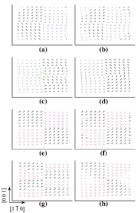 | Fig. 5 Snapshots of electric dipolar configurations a-d and (-1)nx(i) + ny(i) + nz(i)ωi, AFD patterns e-h in a BFO nanodot of 5 nm lateral size under a curled electric field oriented along [-1 -10] |