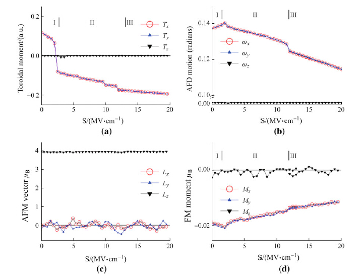 | Fig. 6 Electrical toroidal moment a, AFD-related quantity x b, AFM vector c, and magnetization d as functions of the magnitude of the S vector applied along the [-1 -10] direction [42] |