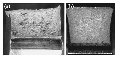 The Charpy impact test with a V-notch specimen was carried out at room temperature as per ASTM E23 to get an indication of the impact resistance of the material against stress concentration at the change of the section. This would also indicate the resistance of material against the crack propagation, once a crack was observed in the material. Results of Charpy impact test were presented in Fig. 10. The test results revealed that the impact resistance of laser processed material for 0° and 90° rastering pattern was (102 ± 5) J and (100 ± 3) J, respectively. The obtained impact resistance was at par with that of conventionally processed material, while the impact resistance of PTA deposited material for 0° and 90° rastering pattern was (85 ± 3) J and (90 ± 4) J, respectively. The results revealed that the impact strength for LRM and PTA deposits were found to be within ±15%. The fractographs (see Figs. 11a, 11b) of the impact testing samples confirmed that the shear lip was formed before the failure during impact testing, and it was clearly visible on the fracture surface indicating ductile nature of the fracture.