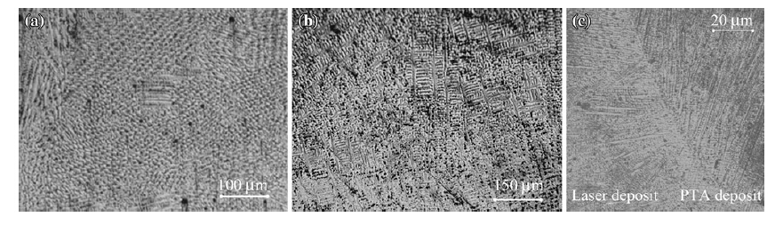 | Fig. 4 Different mechanical properties of deposits depending upon the regions of deposited material a typical microstructure of LRM deposit, b typical microstructure of PTA deposit, c microstructure at interface of two deposits |