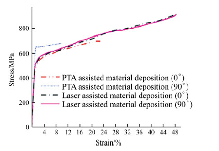 | Fig. 6 Typical stress-strain curve of laser and PTA deposited Inconel-625 |