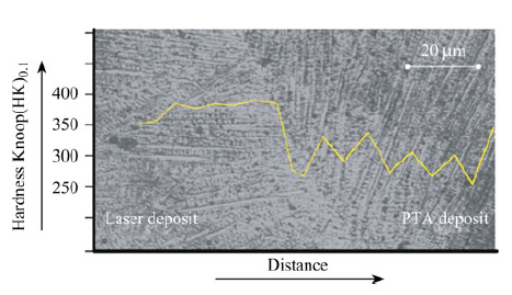 To evaluate the hardness of the deposited materials, the Rockwell hardness test was carried out as per ASTM E18. The hardness of LRM and PTA deposited materials was in the range of 46-52 HRc and 37-42 HRc respectively, while that of solution annealed was 27 HRc. The higher hardness in LRM and PTA deposited materials was due to rapid cooling rate during processing, which resulted in finer grain structure. The observation was confirmed through a post annealing treatment of the deposited samples, in which the hardness value was brought down to the range of 29-30 HRc. Hardness profile of hybrid deposition with two successive deposition processes was also carried out. The observed hardness of the deposits without annealing was presented in Fig. 7. A zig-zag pattern was observed in microhardness values in PTA deposits. This pattern might be due to larger phase of carbides (primarily MC and M6C), which were inherently present in Inconel-625 alloy [12]. It was well known that the total heat input in laser assisted processes (like LRM) was significantly less than that in PTA processes due to associated high energy density in case of laser processing. This higher energy density resulted in steep thermal gradient and subsequent faster cooling rate in the materials subjected to laser processing. On the contrary, relatively slower cooling rate was seen during PTA processes. This slower cooling rate was the cause of the larger phases of carbides (primarily MC and M6C) in PTA processed samples. It was also evident in Fig. 7 in the form of larger columnar dendritic structures in the sections of PTA deposited samples.