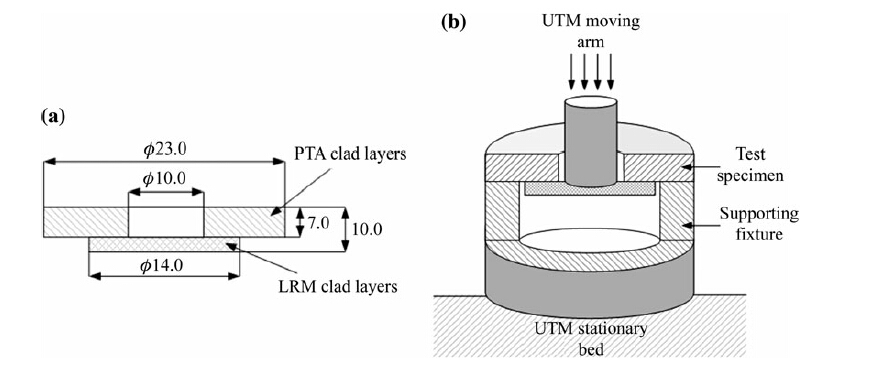 The adhesion strength of coatings was generally evaluated by a tensile adhesion test in which procedure defined in ASTM C633-79. However the test procedure governed the use of adhesive material for joining jig with coated surface, therefore the measurable strength limited the strength of the adhesive. Paul et al. [21] conducted adhesion cohesion test for evaluating bond strength between WC-Co clad layers. Similar procedure was adopted for evaluating the cohesive strength between LRM and PTA layers. In this test, a square of 30 mm × 30 mm and 15 mm thickness was cladded with about 3 mm thick LRM cladding and 12 mm thick PTA cladding layers. Then, the samples were prepared as shown in Fig. 8a. The strength was determined by compressive testing of the specimen using the universal testing machine, as shown in Fig. 8b.