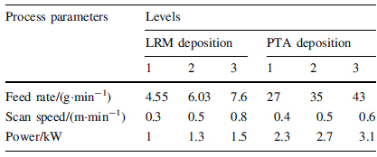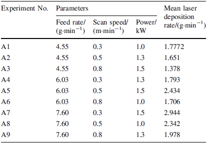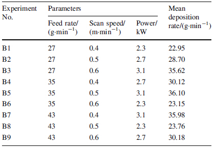 A set of experiments was carried out as per L9 orthogonal array and a number of tracks were deposited. The width and height of the tracks were measured at least at three locations to calculate the deposition rate. The deposits were also examined for visual, macro and micro examination. The set of process parameters which yielded regular and continuous tracks with the highest deposition rate were selected for bulk deposition in both processes. The mean material deposition rate for each experiment was calculated from the experimental results. Tables 3 and 4 summarize the mean deposition rate for both the material deposition processes, as per L9 array.