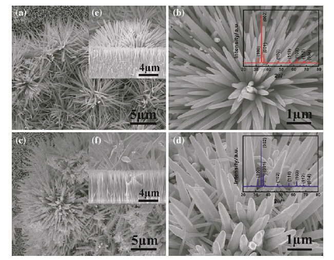| Fig. 1 (a) Top-view, (b) high-magnification and (e) side-view SEM images of nanoflower-nanorod structure; (c) the top-view, (d) highmagnification and (f) side-view SEM images of nanodendrite-nanorod structure. The inset curves in (b) and (d) are the XRD patterns of nanoflower-nanorod structure and nanodendrite-nanorod structure |