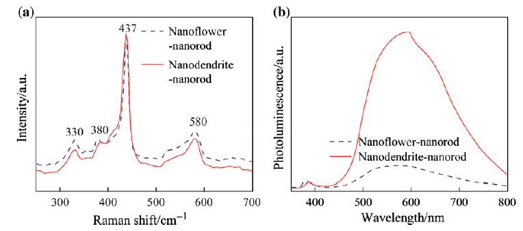 Raman-scattering spectra of nanodendrite-nanorod and nanoflower-nanorod structures normalized by the highest peak are employed to analyze their crystal structures and defects (see Fig. 2a). The crystal structure of ZnO is wurtzite (hexagona) and belongs to the C46v space group. It has two formula units per primitive cell, and all atoms occupy the C3v sites. According to the Group theory, there are eight sets of zone centre optical phonons, where A1 and E1 modes are polarized and split into transverse optical (A1T and E1T) and longitudinal optical (A1L and E1L) phonons, while the E2 mode consists of two Raman-active modes: low- and high-frequency phonons (E2L and E2H). The dominated peak at 437 cm-1, labeled as E2, is the characteristic of ZnO wurtzite hexagonal phase (see Fig. 2a). Peak at 330 cm-1 is the second-order Raman spectrum, originating from the zone boundary phonons 3E2H-E2L. And peak at 380 cm-1 can be labeled as A1L. The peak at 580 cm-1 assigned to E1L is also observed. Generally, it is related to the formation of defects in ZnO (oxygen vacancies and Zn interstitials) [29]. The lower E1L signal in nanodendrite-nanorod structure indicates the fewer defects in ZnO crystal structure.