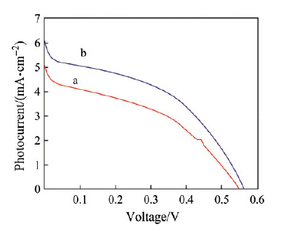 | Fig. 3 J-V curves of DSSCs nanoflower-nanorod a and nanodendrite- nanorod structures b |