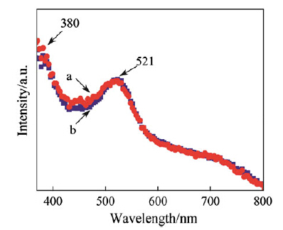 The short-circuit current of DSSC is mainly influenced by the light harvesting and charge recombination at photoanode [30, 31, 32]. Based on the approximate thickness of films (see Figs. 1e, f), the similar dye absorption of different structures is achieved (see Fig. 4). The absorption of dye adsorbed on nanodendrite-nanorod and nanoflowernanorod structured ZnO is almost of the same value at 380 nm and 521 nm, which is the maximum absorption peak of N719 dye. The values of dye adsorption on the nanodendrite-nanorod and nanoflower-nanorod structured ZnO are 3.2 × 10-7 mol/cm2 and 3.1 × 10-7 mol/cm2, respectively. Compared with the nanoflower-nanorod structure, the increased surface area in nanodendritenanorod structure by the formation of needle-like branch is offset by the large diameter/length ratio of the petals on the top layer. It suggests that the dye loading amount is not responsible for the increased Jsc in the DSSC with nanodendrite- nanorod structured ZnO. Therefore, a lower charge recombination rate of nanodendrite-nanorod structures may be the main reason for the enhanced DSSC performance. It is believed that the decreased carrier recombination at the dye/ZnO interface can be obtained by lower concentration of surface defects in ZnO material [33]. Hence, fewer defects in nanodendrite-nanorod nanostructure as demonstrated by Raman and photoluminescence analysis, may lead to improved device performance.