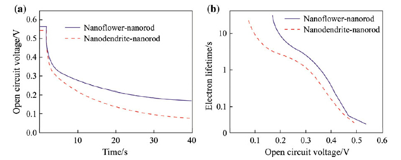 The results of electron lifetime on the open-circuit voltage of DSSCs with different structures clearly demonstrate that, at any given open circuit potential, the electron lifetime of DSSC with nanodendrite-nanorod structure is longer than that of nanoflower-nanorod one (see Fig. 5b). The prolonged electron lifetime should be attributed to the lower electron recombination caused by the fewer defects in the nanodendrite-nanorod structure. The more efficient electron transport channel finally leads to higher energy conversion efficiency. 4 Conclusions