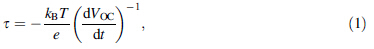 From the OCVD experiment, the electron lifetime (s) is determined by the reciprocal of the derivative of the decay curves normalized by the thermal voltage [34], using the following equation: