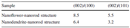 XRD patterns of nanoflower-nanorod and nanodendritenanorod structures (see insert of Figs. 1b, d) are all indexed as hexagonal wurtzite structure according to JCPDS card No.36- 1451). No excess peaks are detected, implying the high-purity of both ZnO nanostructures synthesized by the hydrothermal method. The obtained XRD patterns are dominated by (002) peak, which is in agreement with the structure of c-axis oriented bottom layer and multi-oriented top layer. The relative peak ratios of (002)/(100) and (002)/(101) of both structures are listed in Table 1. The less (002) orientation of nanodendrite- nanorod structure indicates its more lateral growth contrasting to the nanoflower-nanorod one.