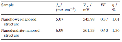 The photocurrent density-voltage characteristics of DSSCs based on nanoflower-nanorod and nanodendrite-nanorod structured ZnO are obtained at AM 1.5 irradiation of 100 mW/cm2 (see Fig. 3). The detailed photovoltaic performance parameters of DSSCs with different structures are listed in Table 2. The short-circuit photocurrent density (Jsc), open-circuit voltage (Voc) and fill factor (Ff) of device with nanoflower-nanorod structured ZnO are 5.07 mA/cm2, 545.98 mV and 0.37, respectively, leading to 1.01% of energy conversion efficiency. While the performances of the DSSC with nanodendrite-nanorod structure are improved by 20%, 3% and 8% in Jsc, Voc and Ff, respectively, finally resulting in 35% increase in energy conversion efficiency.