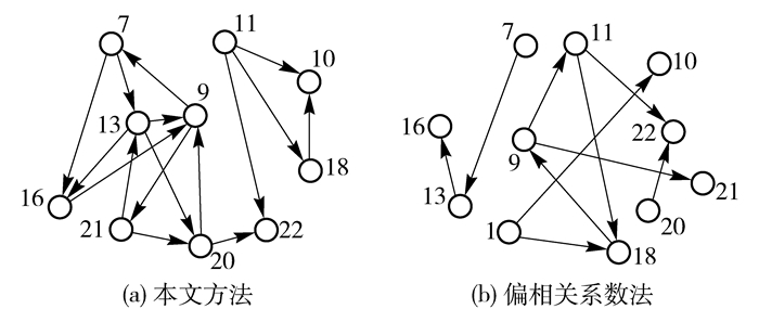 4.2.1 无故障TE过程在TE仿真模型中不设置任何故障,采集数据,运用本文方法与偏相关系数方法得到对应的网络结构(图 3),并分别计算网络度量指标。