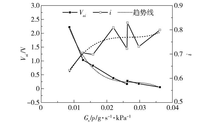 为获得进料率与传感器参数之间的关系,对进料率进行了测量。电平均值Vai、固气比i与进料率Gs的关系如图 7所示。可以看出:随Gs的增大,Vai先快速降低,后趋于0,与幂函数第一象限的变化规律近似;同时,i先快速增大,后趋于不稳定波动值。这可能是气固两相流由稀相逐渐向密相过渡导致,当i达到0.8以上时,颗粒基本将传递到传感器的激光光强降到最低,且受颗粒间重叠遮挡的作用,Vai趋于0。